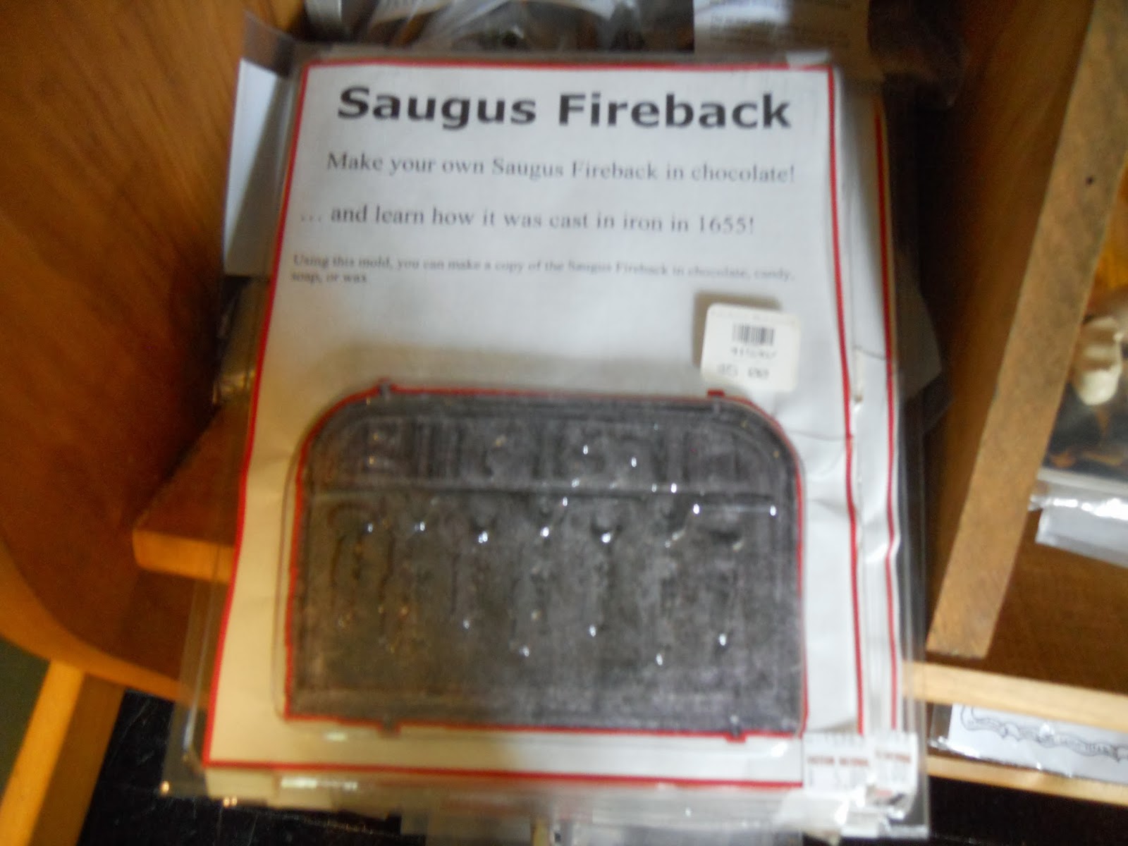 | Package reads "Make your own Saugus Fireback...and learn how it was cast in iron in 1655!" Inside the packaging is a chocolate mold in the style of a fireback cast at the ironworks. |